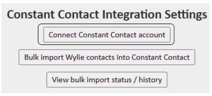 - Then select the second button to ‘Bulk import Wylie Customers into Constant Contact’. This may take a few minutes. Please leave the dialog box up for as long as possible while the data is being processed. If you receive an error, your data is likely still syncing in the background and this process may take until the next morning to finish. However, after this initial sync, the data syncing is instant/automatic.