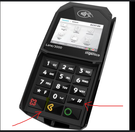 To reboot the terminal, hold down the # key and the yellow button simultaneously (picture below). The terminal will then begin its reboot.
