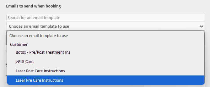 - In the service creation form, you will find an area 'Emails to send when booking' where you can type to search or choose an email template from the drop down.