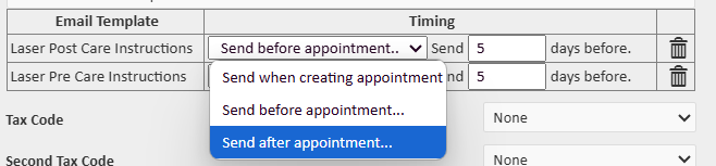 - Choose the corresponding pre and post care instruction email templates that you would like sent automatically prior to or following the service appointment.