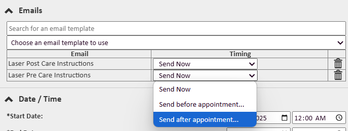 - When scheduling an appointment in the scheduler, there is an 'Emails' section on the appointment creation form. This section is where you will designate which email templates are to be sent and their timing.