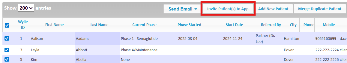 - Then, select the 'Invite Patients to App' to prompt the invite email to appear and select 'Send Invitation'.