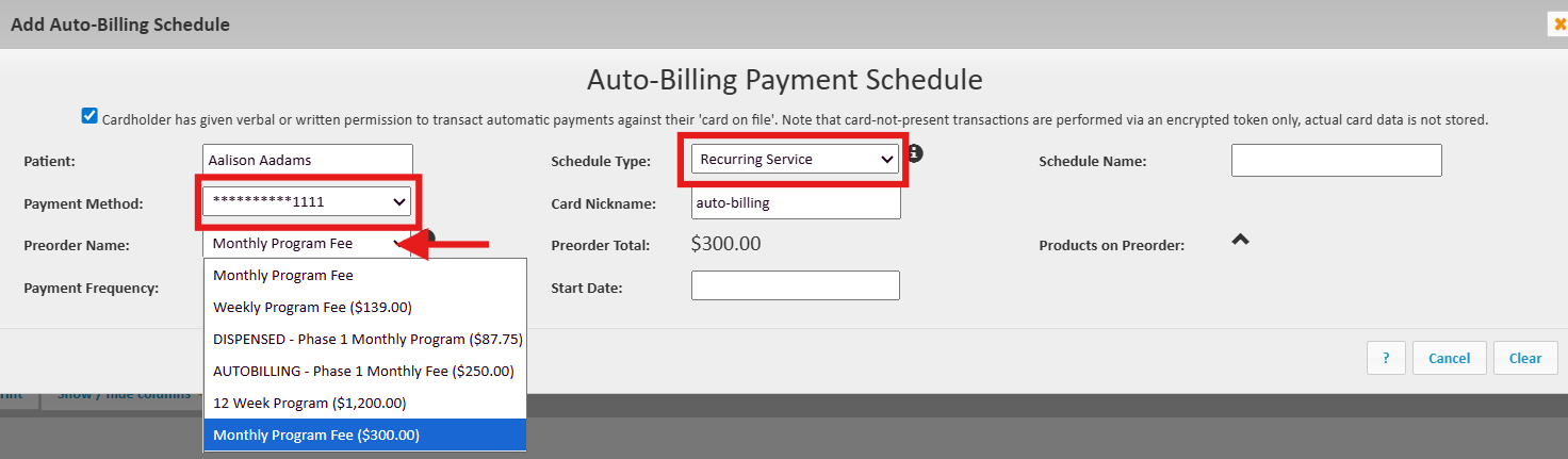 - Choose the 'Preorder Name' of a saved preorder that you would like to charge the client for on a recurring basis. You must first create the preorder in the sales register. This preorder can include a combination of services, products, and packages.