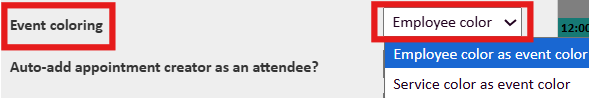 - Select the 'event colour' dropdown and choose the option you prefer between 'employee color as event color' or 'service color as event color'.