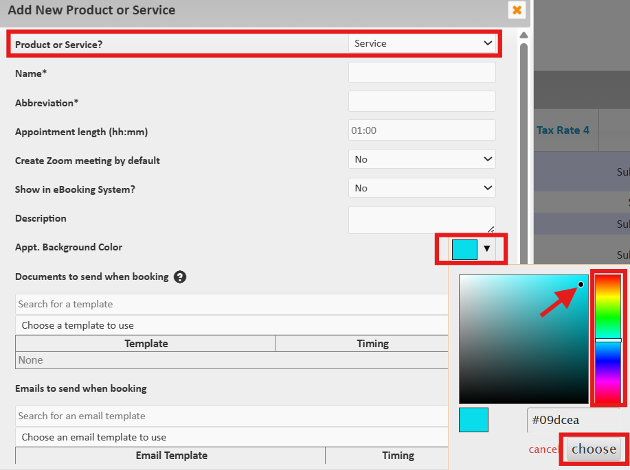 - When adding or editing a service, select the color picker tool, then select the color range on the right side and choose the exact color you would like to assign to that specific service. Lastly, select 'Choose'.